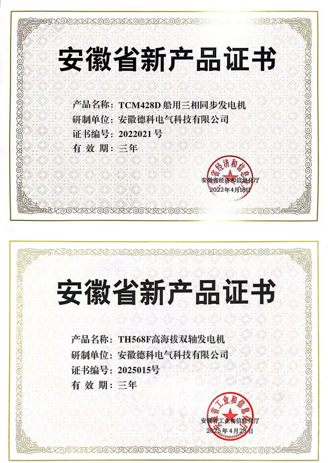 2025年5月,博天堂网址电气自主研发的TCU468G陆用六极自励磁发电机与TH568F高海拔双轴发电机,凭借领先技术优势,双双通过权威评审,成功入选《2025年第一批安徽省新产品认定名单》。